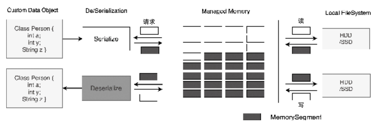 - FileChannelOutputView:底层基于BlockChannelWriter将MemorySegment中的数据输出到磁盘