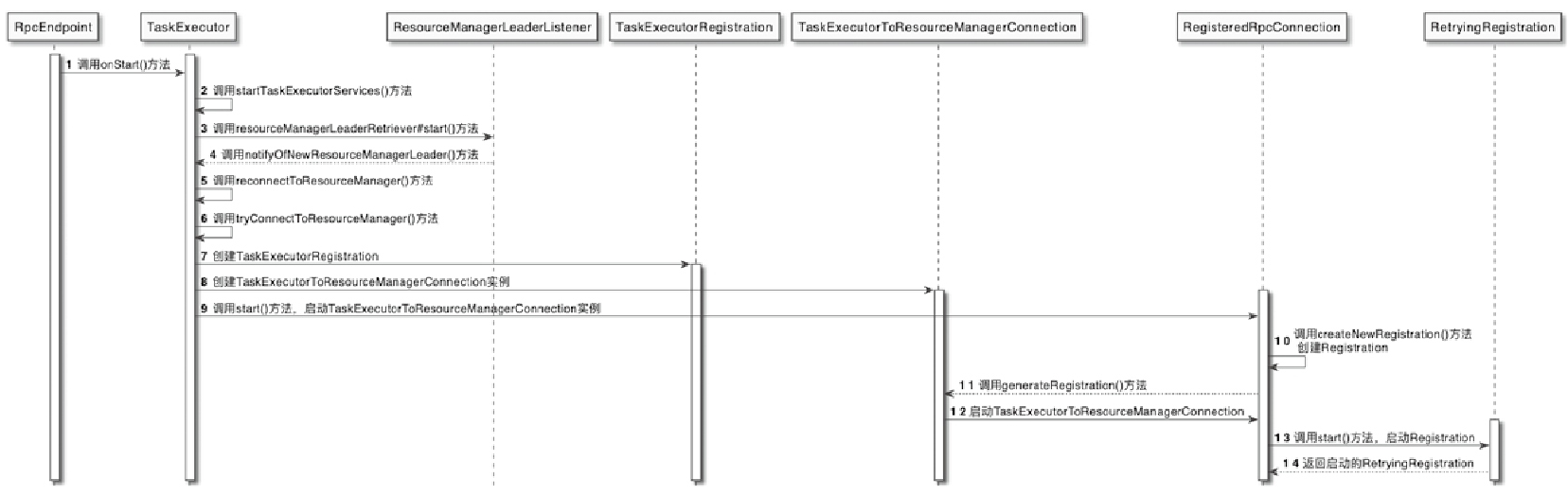 - 最终完成在ResourceManager中注册TaskManager的操作。创建的TaskExecutorRegistration同时会传递给ResourceManager