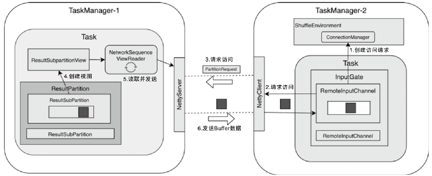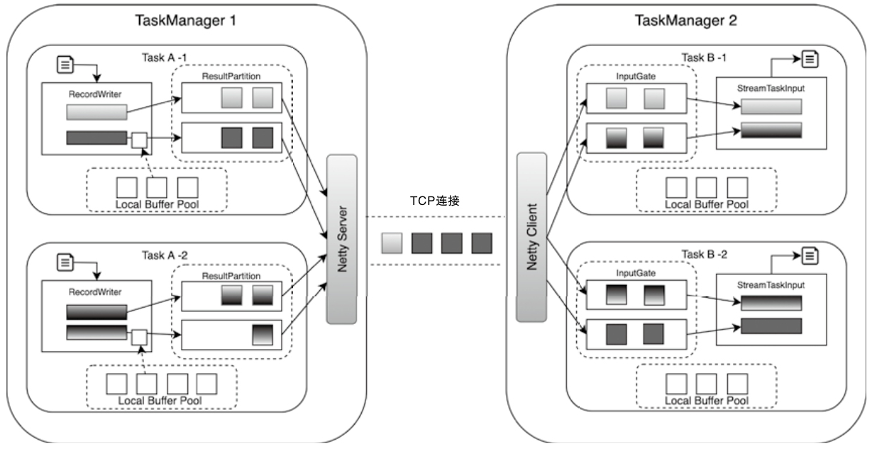 - 上游的Task会创建NettyServer作为网络连接服务端,并与下游Task内部的NettyClient之间建立网络连接
