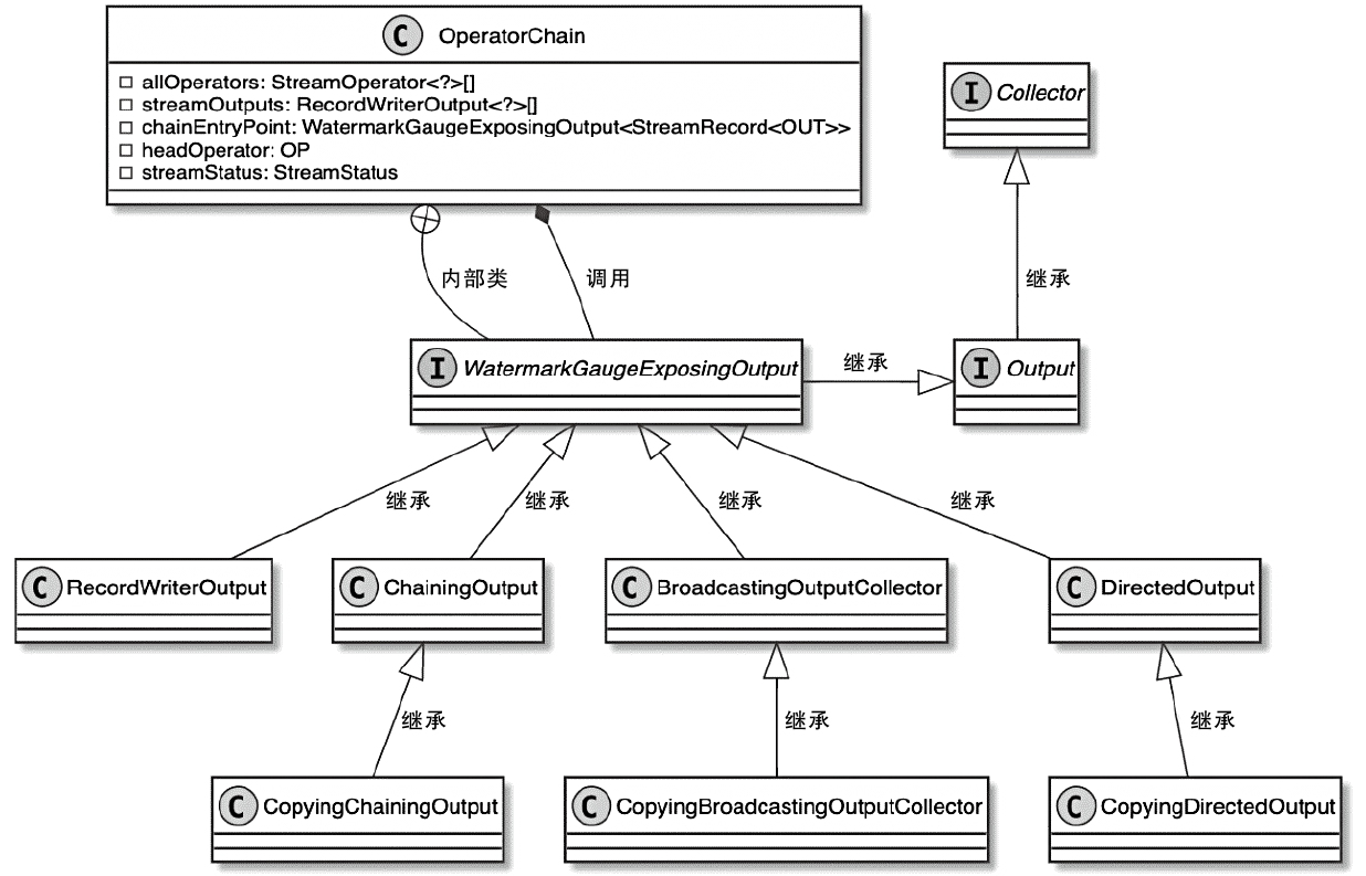 - DataOutput:负责将StreamTaskInput接收的数据发送到当前Task实例的OperatorChain的HeadOperator中进行处理