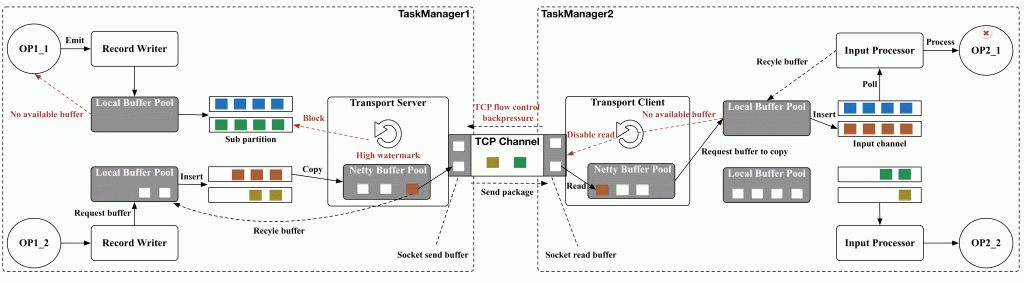- If the NetworkBufferPool is exhausted, LocalBufferPools trigger backpressure by pausing data production/consumption.