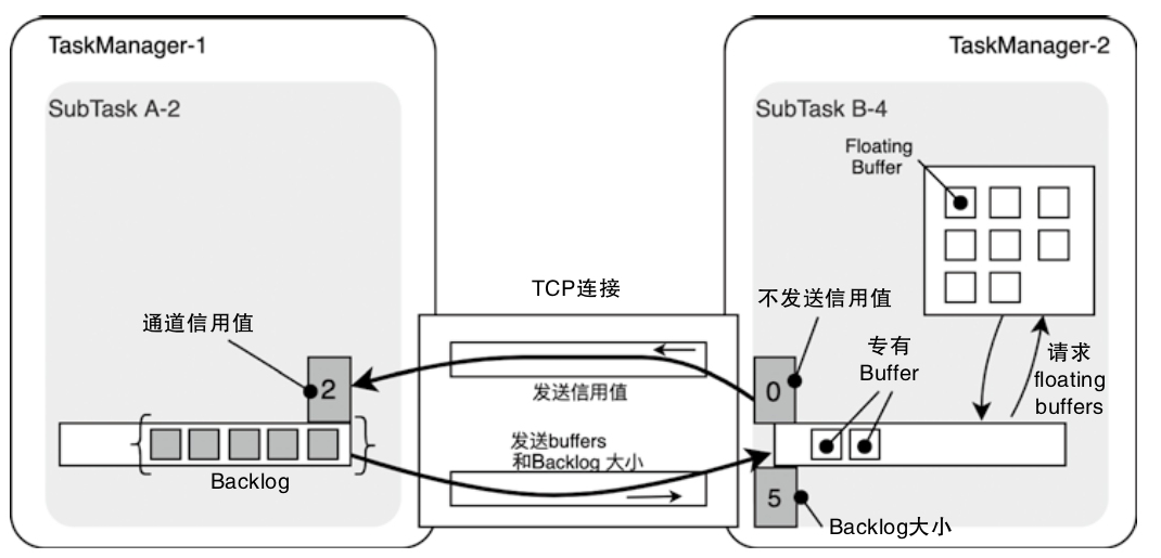 - Downstream tasks allocate credits (numerical values) to upstream tasks, indicating the maximum amount of data (measured in buffers) they can currently process.