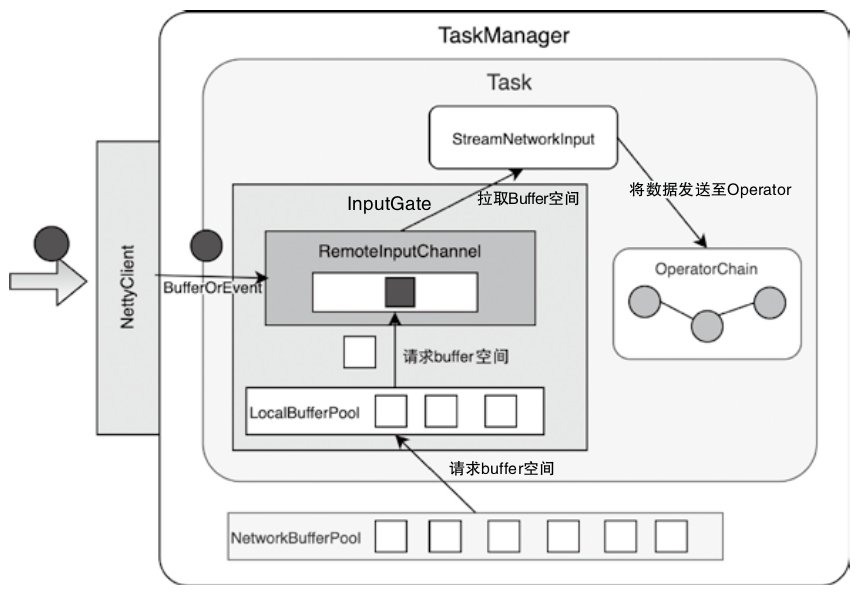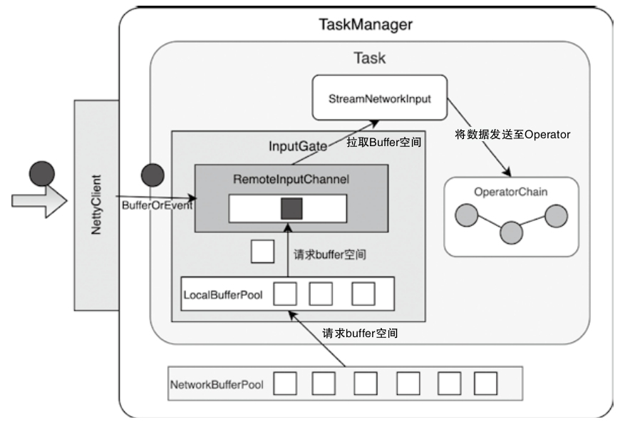 - 下游的Task实例,会通过InputGate组件接收上游Task发送的数据