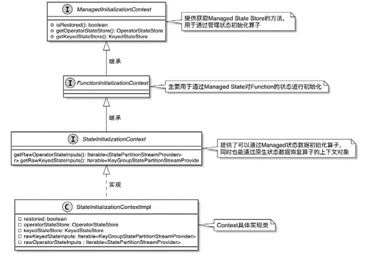 - ManagedInitializationContext接口提供了托管状态使用的KeyedStateStore和OperatorStateStore获取方法