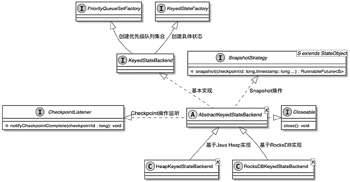 - Flink主要提供了基于JVM堆内存和RocksDB实现的KeyedStateBackend