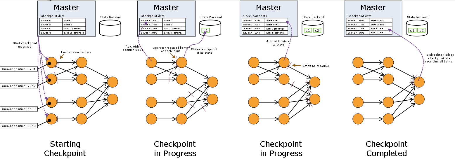 - 下游算子节点根据上游发送的Checkpoint Barrier事件控制算子中Checkpoint操作的触发时机
