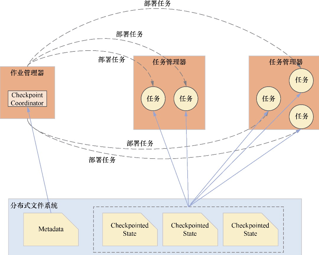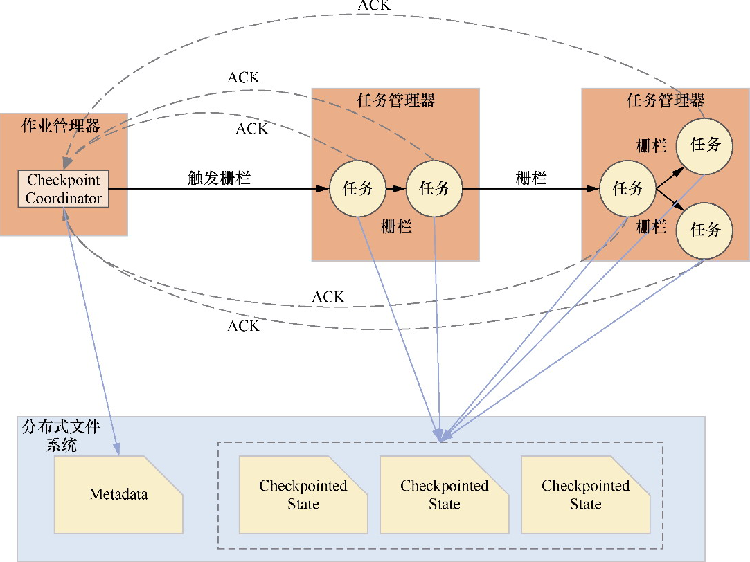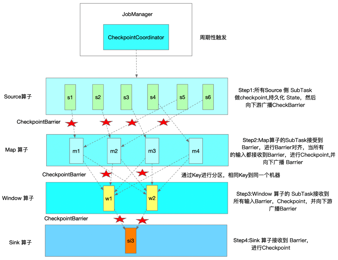 - 数据源节点中的Checkpoint操作触发,通过CheckpointCoordinator组件进行协调和控制