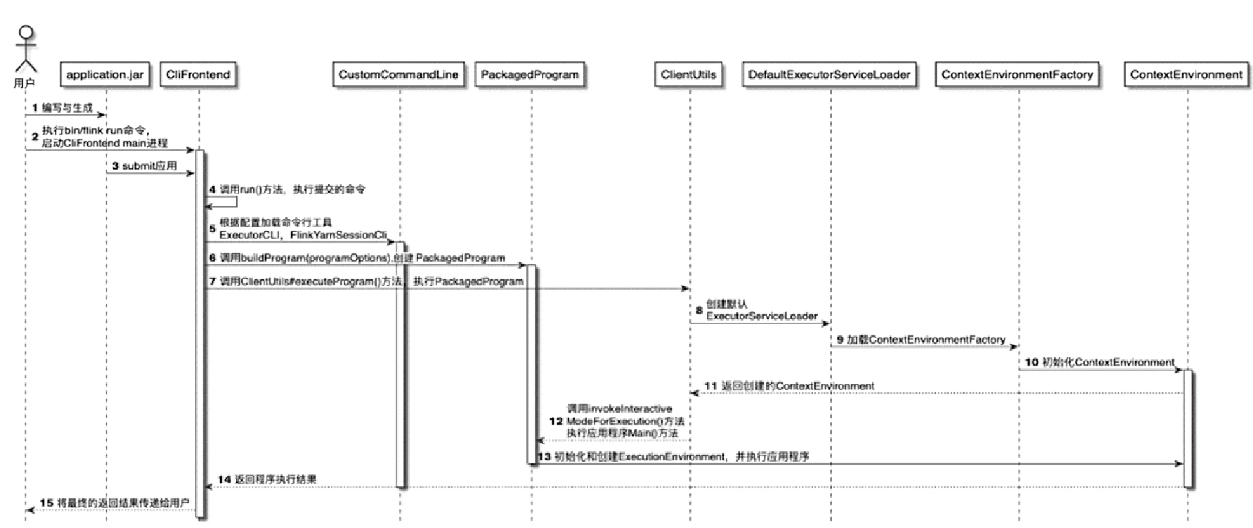- CliFrontend parses the run command and initializes PackagedProgram with the user’s JAR and arguments
