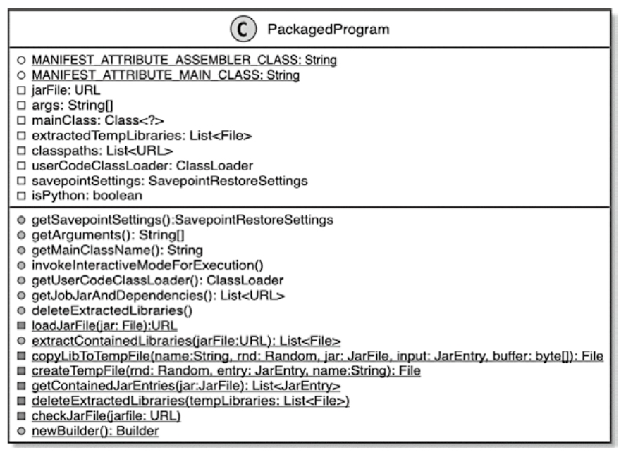 - 调用CLIFrontend.buildProgram(programOptions)方法,将提交的应用程序打包成PackagedProgram。PackagedProgram包含应用程序中的mainClass、classpaths等信息,实际是在客户端的进程内将用户提交的作业代码打包成的可执行程序