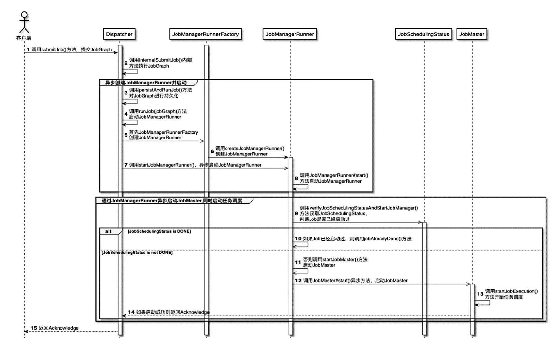 - 如果启动成功,会将Acknowledge信息返回给Dispatcher服务,再给客户端