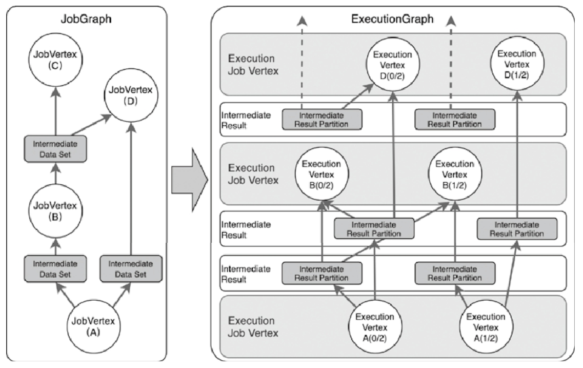 - 集群运行时接收到JobGraph之后,会通过JobGraph创建和启动相应的JobManager服务,并在JobManager服务中将JobGraph转换为ExecutionGraph