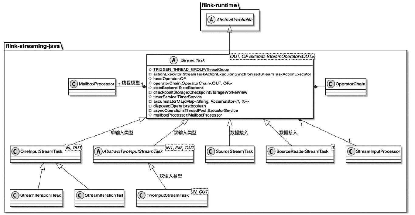 - StreamTask又包含 SourceStreamTask、OneInputStreamTask以及TwoInputStreamTask 等