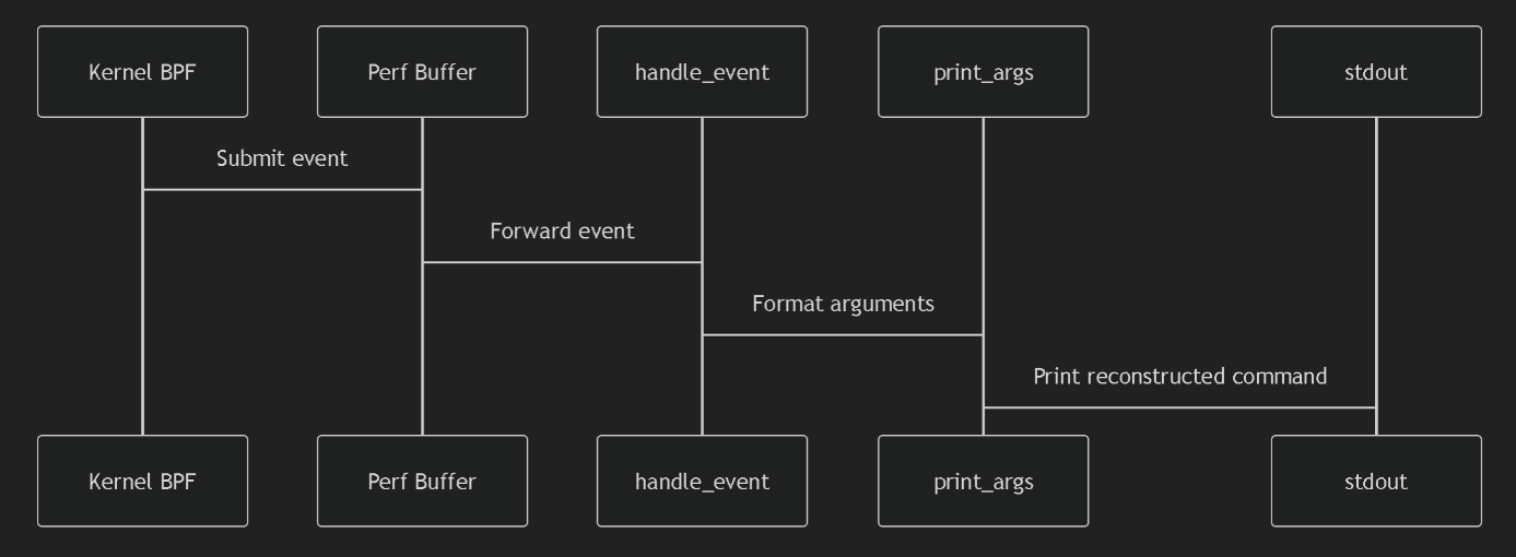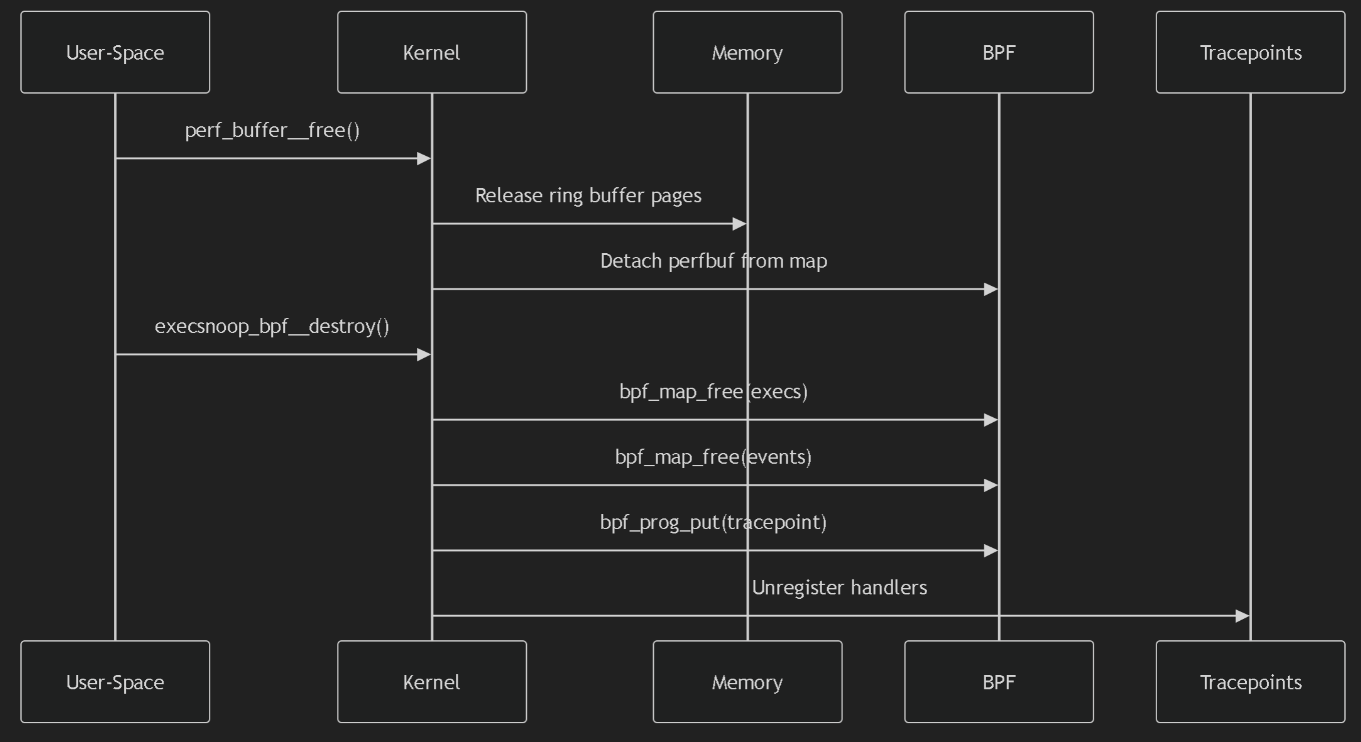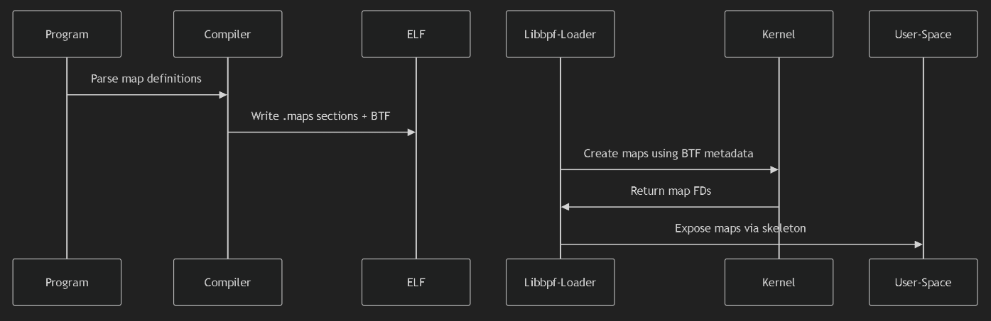 - 编译 eBPF 程序为字节码,再用 bpftool 生成 脚手架头文件(Skeleton Header);这个头文件包含了 eBPF 字节码以及相关的加载、挂载和卸载函数,可在用户态程序中直接调用