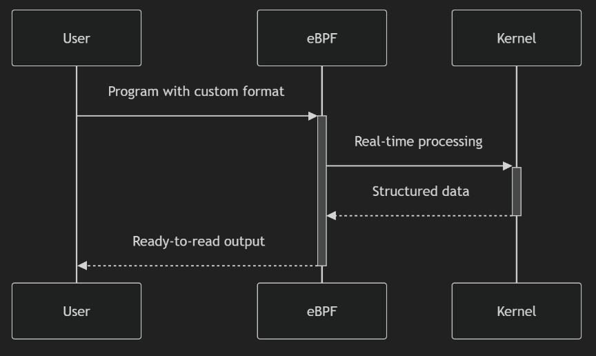 - 返回的内容是固定格式的,比如 进程名、地址之类的,而 bpf 是自定义的格式