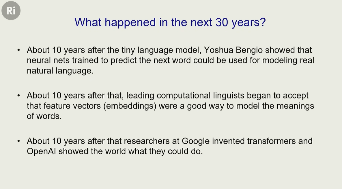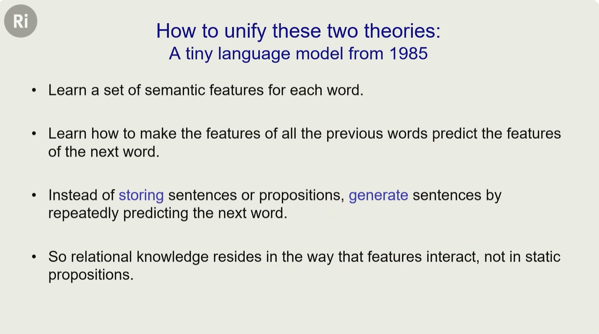 辛顿建立了一个小语言模型,将前面的两种派系:符号人工智能 和 心理学 统一起来了