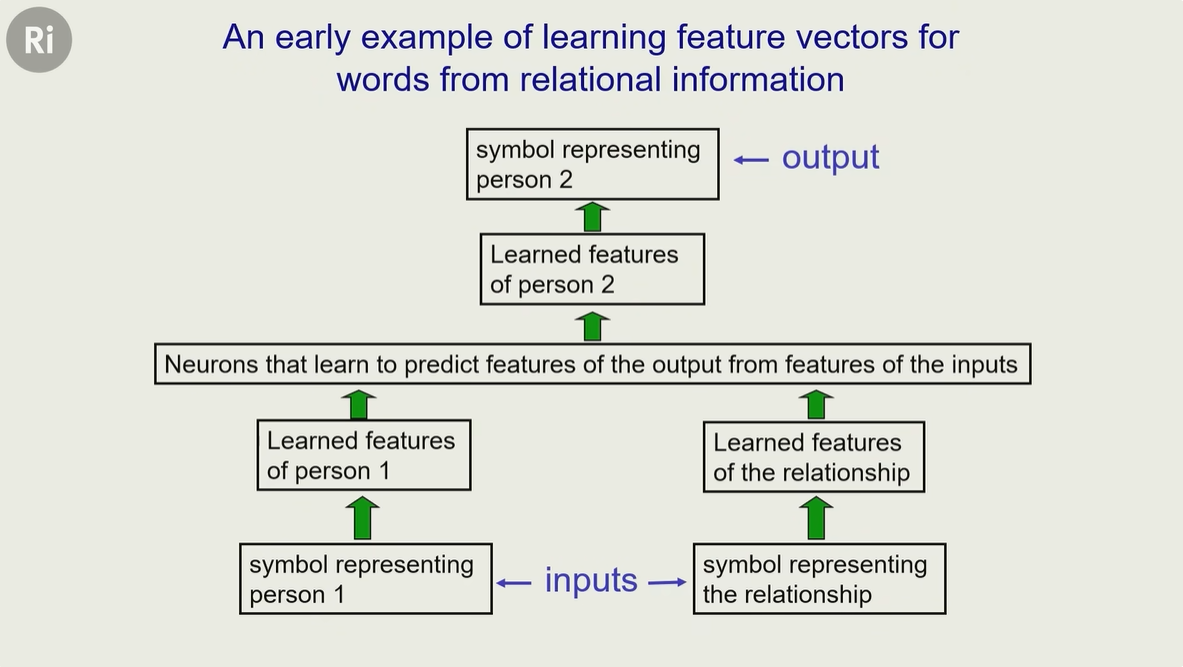 辛顿在 1985年做的小模型,类似于现在 chatGPT、豆包这样的大语言模型前身,但本质类似