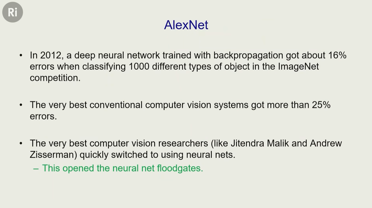2012年的时候,一种利用反向传播训练的深度神经网络,在 ImageNet 竞赛中对 1000 种不同类型物体进行分类时,错误率约为 16%