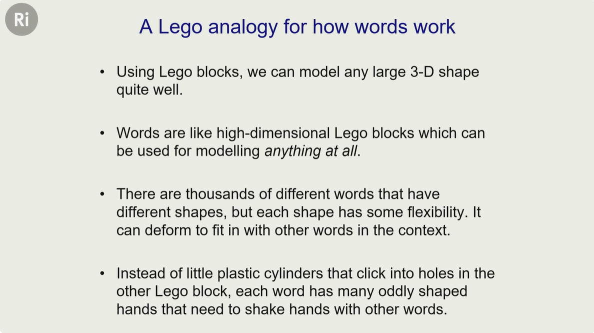 辛顿用【乐高积木】来做比喻,我们可以用乐高积木拼出任何复杂的形状,比如汽车,城堡 等等 乐高是 3D 的,刚好匹配人类生活的三维世界,所以我们好理解