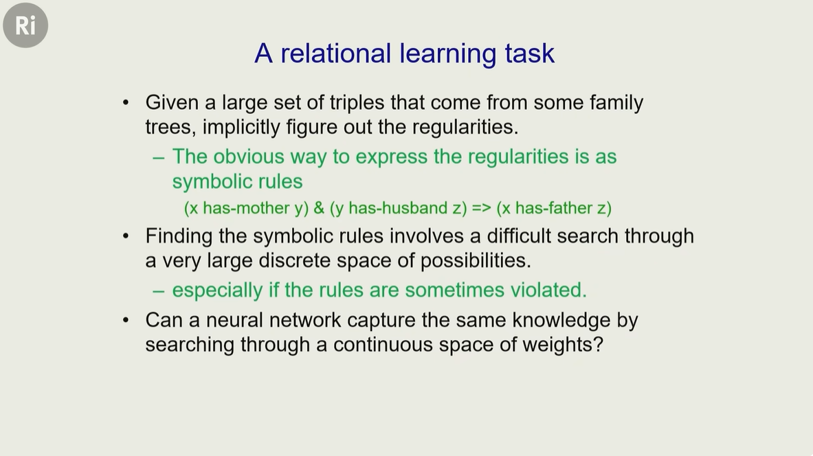 神经网络能不能在 “连续的权重调整中”,自动学到这些家族关系的规律,替代符号规则?