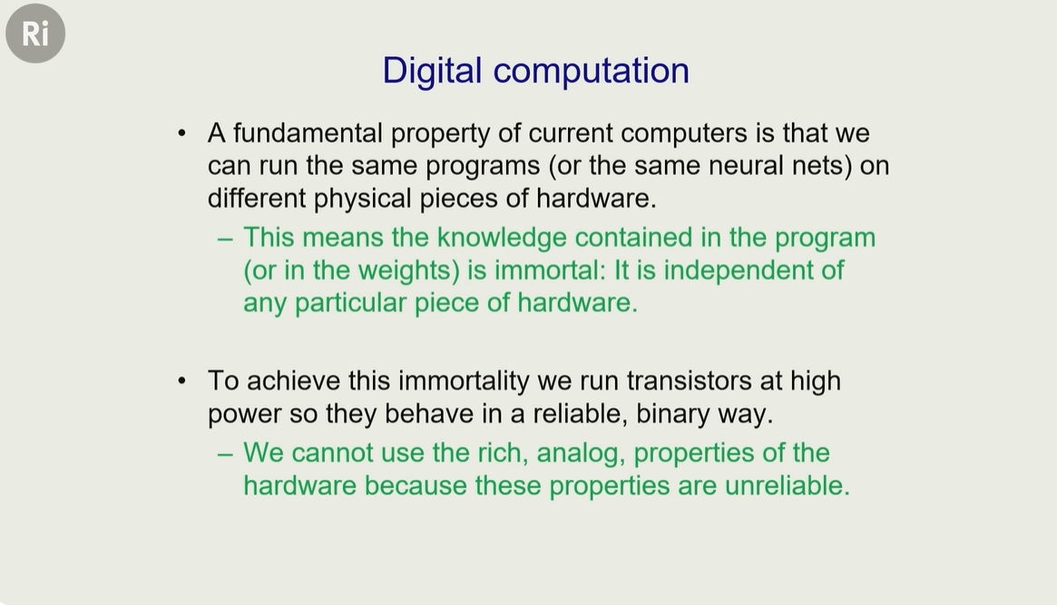 因为知识(比如程序代码、模型权重 )不依赖 “特定硬件”,比如 换个硬件也能跑,不会因为某台硬件损坏就消失为了实现 这种 软硬件分离的特点,就不能使用模拟信号了,那样会破坏程序的可移植性(程序在 A硬件上可以运行,在 B上就不能运行了)