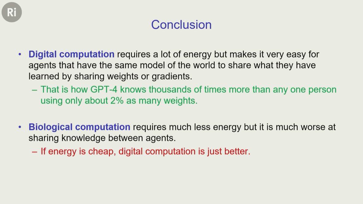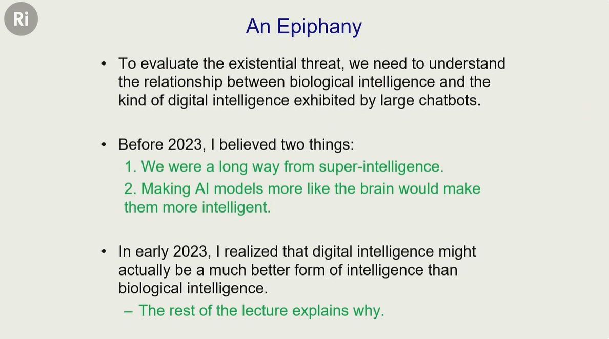 2023 年,辛顿突然意识到,自己可能是错的,数字智能 可能比人类这种生物智能更优越